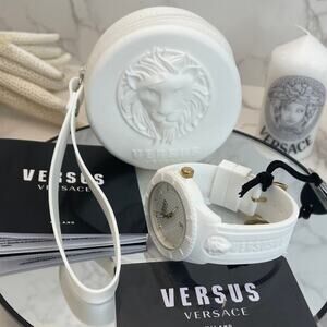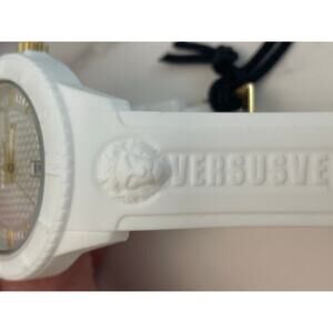 Elegant Unisex Versus Versace Watch, Date Function, White Silicone Band, Gold Accents. Silicone Zippered Pouch, Date Display, Water Resistance Depth 50 Meters.