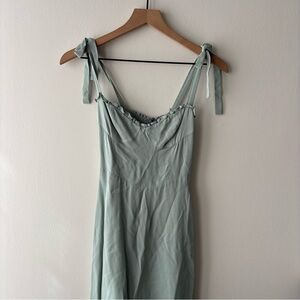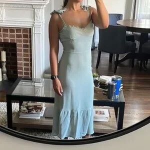 Elegant midi dress with a fitted bodice. Features a ruffled hem. Perfect for any occasion.
