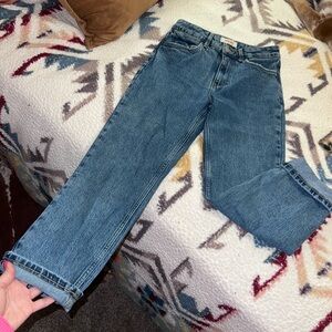 Authentic Wrangler jeans in classic blue. Durable and versatile. High rise and cropped rodeo jeans. Size 2 and 27 length