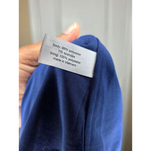This is a pre-owned Lane Bryant women's plus-size dress, size 22/24, featuring a blue floral pattern with white and light blue accents. The dress has a V-neckline and short sleeves. It appears to be knee-length and has a gathered detail at the back waist. The fabric content is 99% polyester and 1% spandex for the body, with a 100% polyester lining, and it was made in Vietnam. A measuring tape indicates a length of approximately 40 inches from shoulder to hem. No significant imperfections are visible.