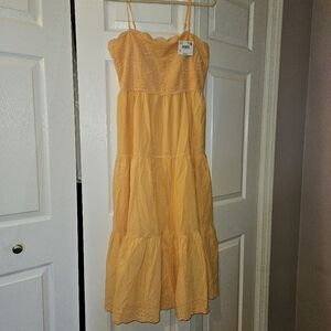NWT American Eagle Outfitters orange Scalloped Tiered Midi Dress size M. A breezy, beautiful dress with femme flair, featuring scallop details galore. Crisp cotton fabric, spaghetti straps, scalloped, neckline and hem, eyelet details, tiered skirt, lined,100% cotton. Boho look.