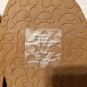 Cozy meets luxury w/ these Coach women’s slippers size 10. Designed w/ iconic “C” Coach pattern, they ft. light brown base w/ darker brown monogram on the uppers & matching patterned brown soles. The interior is lined w/ soft faux fur & cushioned padding for maximum comfort. perfect for lounging in style or gifting to a Coach fan. Pair w/ your favorite loungewear set or joggers for an elevated at-home look, or gift as a chic & practical accessory.