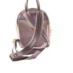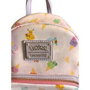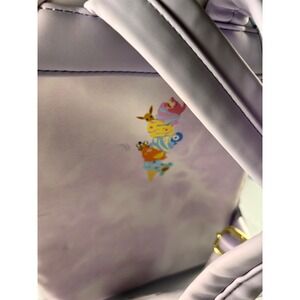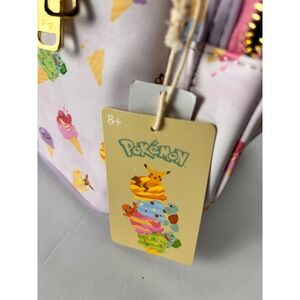 Loungefly Pokemon mini backpack features an all-over print of favorite characters like Pikachu, Squirtle, Charmander, and Bulbasaur reimagined as colorful ice cream cones. Crafted from simulated leather with a soft lavender acid wash background, this bag includes a front zippered pocket, gold-tone hardware, and the iconic metal brand plaque. Perfect for fans and collectors, it offers a whimsical way to carry essentials while celebrating the world of Pokemon.