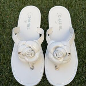 2026 CHANEL CC LOGO WHITE PATENT LEATHER CAMELLIA THONG LEATHER SANDALS 39 C