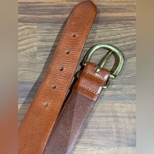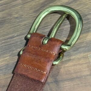 Elevate your style with this brown leather belt featuring a sleek gold buckle. Perfect for any occasion. 30” in length. Will fit a small