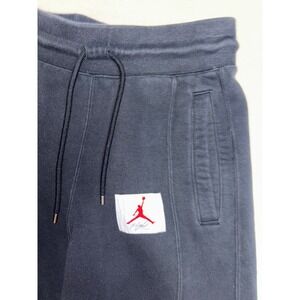 Jordan Flight fleece sweatpants in a washed black finish offer a relaxed, standard fit with a tapered leg and ribbed cuffs. Constructed with a heavy-weight cotton blend, these joggers feature a distinctive Flight logo patch on the thigh and unique curved seam detailing for a modern athletic look. An elastic waistband with an adjustable drawstring ensures a secure fit, while side slit pockets and a rear welt pocket provide convenient storage for essentials.