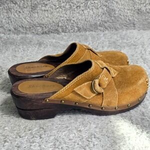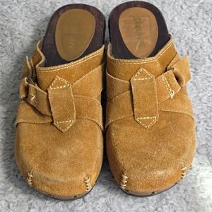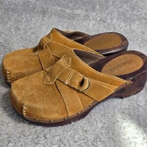 VTG Skechers Y2K Clogs Tan Suede Studded Wood Sole Chunky Platform Mules Women 7