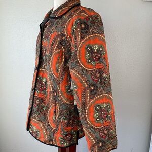 Super unique and colorful button down jacket by Jordan Blue Label measuring 21 inches armpit to armpit laying flat and 28 inches in length from shoulder to hem.