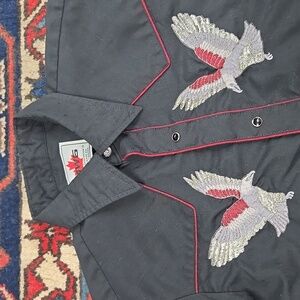Beautiful western shirt with 2 embroidered eagles on the chest and red piping. In very good condition overall. No major flaws. Material is crisp and clean. There is a tiny flaw in the embroidery but no unraveling.