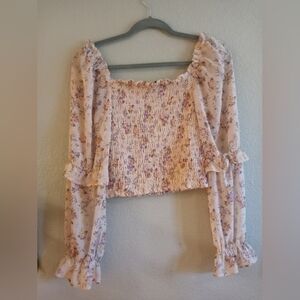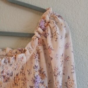 Wild Fable Smocked Fairycore Stretchy Babydoll with Rufed , Puffed shoulder , Sheer Boho tiered flowy sleeves with purple and cream floral cottagecore, Bohemian, Coquette girl print