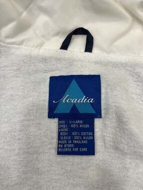 This Vintage Acadia Ocean City Crew windbreaker—navy blue and cream, size XL—feels like it belongs to salt air and long weekends. Lightweight but certain, it cuts the chill without cutting the mood. The colorway is classic coastal: deep navy grounded by clean cream, the kind of pairing that never argues with the horizon.