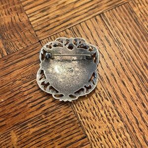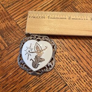 Elegant heart-shaped brooch with intricate silver detailing and a white background.