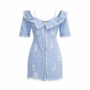 Stylish light blue mini dress with frayed edges. Off-shoulder design with straps. Ideal for casual wear.