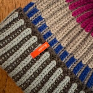 this like new Verloop beanie features a yellow pom-pom and comfortable ribbed knit material in blue pink and gray.