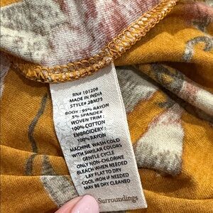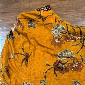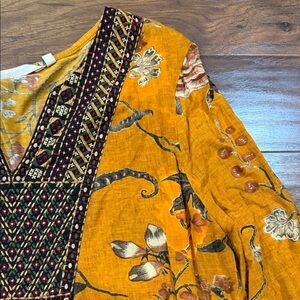 Chic mustard tunic with floral design. Features intricate patterns and a relaxed fit.