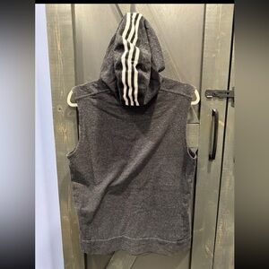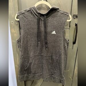 Charcoal sleeveless hoodie with front pocket. Features drawstring hood and Adidas logo.