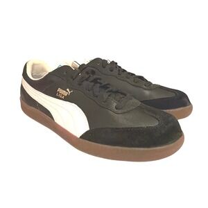 Puma Liga L sneakers in a classic black, white, and gum colorway. These low-top soccer-inspired trainers feature a smooth leather upper with suede overlays at the toe for added durability and style. The iconic white Puma Formstrip stands out against the black base, while gold-tone foil branding on the side and heel adds a premium touch. Finished with a textured gum rubber outsole for excellent grip and a timeless aesthetic. Note that there is some wear to the interior heel lining as shown in photos.