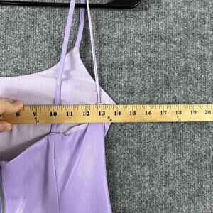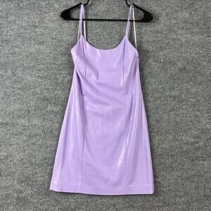 Faux leather mini slip dress featuring a sleek body-skimming silhouette with scoop neckline and double spaghetti straps in a glossy lilac purple finish.
