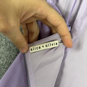 Brand details: alice + olivia woven brand label at interior neckline; interior fabric and care tags with fabrication and style information.