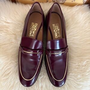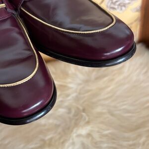 Elegant burgundy loafers with gold trim. Sleek design. Perfect for any occasion.