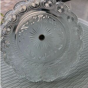 Beautiful glass serving tray with intricate floral patterns. Features a convenient handle for easy carrying. Perfect for entertaining. Roughly 10 inches