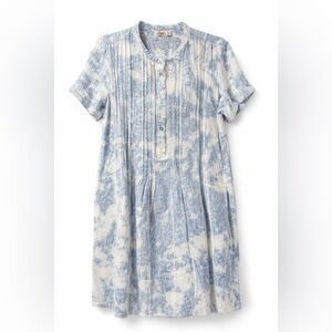 Faherty short sleeve shirt dress in a soft sky blue tie dye print. Lightweight woven fabric with vertical pintuck detailing and a relaxed, easy silhouette. Button front with side pockets — effortless warm-weather piece.