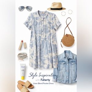 faherty dress, faherty shirt dress, tie dye dress, blue summer dress, beach dress, boho dress, coastal style, linen blend dress, casual mini dress, relaxed fit dress