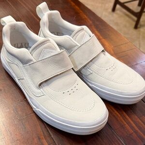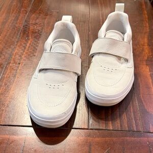 Stylish white leather sneakers featuring a convenient Velcro strap. Perfect for casual wear. Lightly worn, men’s 7, women’s 8.5. In great condition. Material is nubuck suede