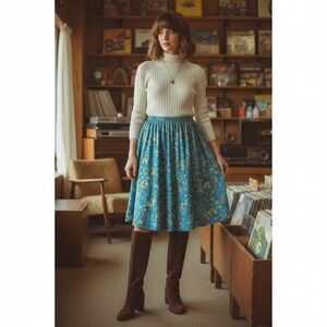 Vtg Liz Baker Skirt Womens Petite Large Blue Floral BOHO CottageCore Aline