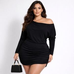 Elegant black draped dress with long sleeves. Perfect for any occasion.
