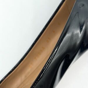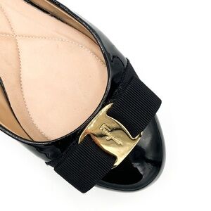 Ferragamo Vara flats, Salvatore Ferragamo shoes, black patent leather flats, Ferragamo bow flats, designer ballet flats, almond toe flats, logo plate flats, classic Ferragamo, luxury shoes, Italian designer flats, low heel Ferragamo, office flats, timeless women’s shoes.