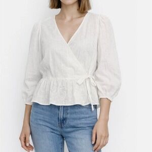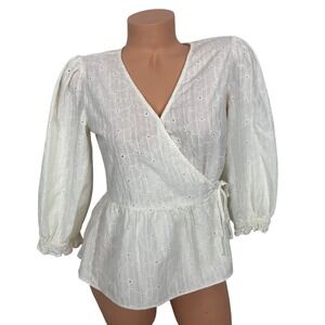 Madewell Embroidered Eyelet Lace Peplum Wrap Top Size S Puff Sleeve V-Neck Boho