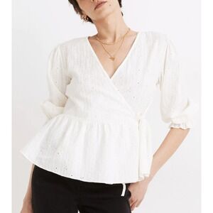 Madewell wrap top in a crisp white cotton eyelet lace. This feminine piece features a classic V-neckline with a true wrap closure and side tie, creating a flattering peplum silhouette. The long sleeves are detailed with puffed shoulders and elasticized smocked cuffs for a romantic touch. Intricate floral eyelet embroidery and scalloped details throughout add texture and charm to this versatile blouse.