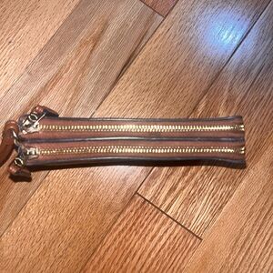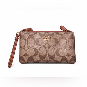 Coach Signature Wristlet Double Zip Brown Khaki Canvas Wallet