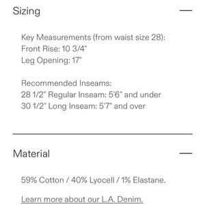 Only worn a few times. I like them a lot but gravitate towards my wider leg styles. These have a nice soft denim and a relaxed fit.