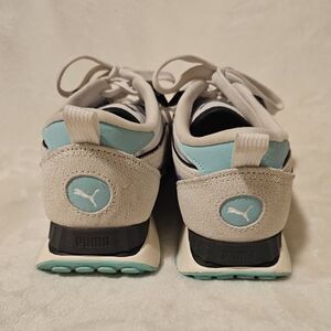 Stylish Puma sneakers with a vibrant design. Features purple, mint green, and white accents. Perfect for active kids.