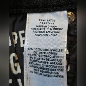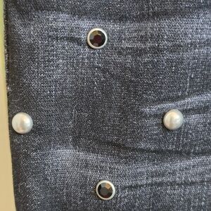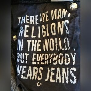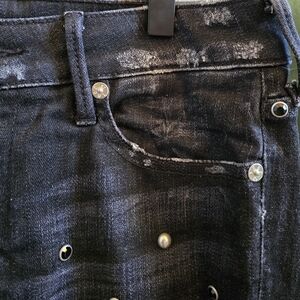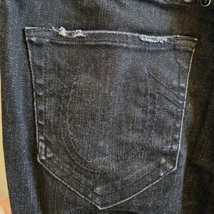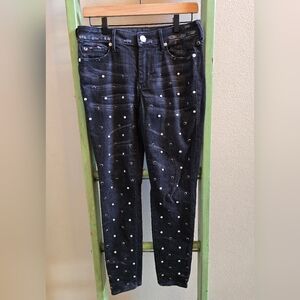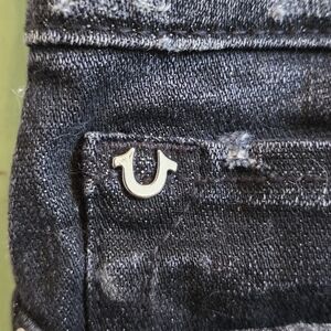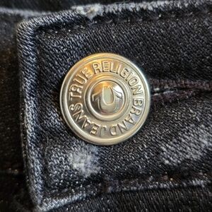 Excellent pre-owned condition. True Religion Halle studded super skinny jeans, black moon stone, size 27. Jet-black gems and silver studs, subtle distressing and whiskering, 5-pocket, zip/button close. Cotton/polyester blend.
