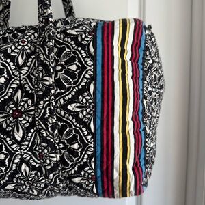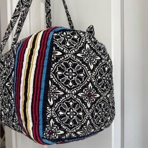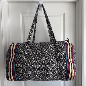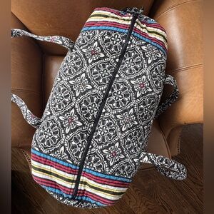 Classic Vera Bradley Large Duffel in the Barcelona print with a black and white floral medallion pattern with bold multicolor stripe accents. This spacious quilted cotton travel bag is lightweight yet roomy, perfect for weekend getaways, carry-on travel, gym, dance, sports, or everyday overnight use.