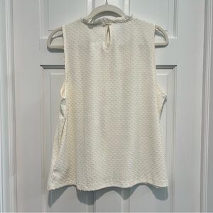 textured swiss dot top, ruffle neck tank, sleeveless cream blouse, feminine spring summer top, romantic style, elevated basic top, business casual sleeveless top, workwear blouse women, polished casual top, minimalist blouse, soft drape tank, classic preppy blouse, timeless wardrobe staple, neutral capsule wardrobe, office to weekend top, vacation spring break