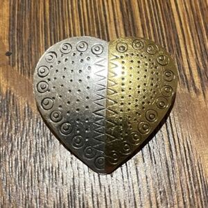 This is a lovely heart brooch that is half silver tone and half gold tone. Overall it is a silver tone brooch. The brooch is 1.5 inches by 1.5 inches.