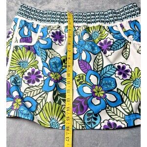 The Athleta women's swim skirt in bright floral design is perfect for summer watersports. Made of polyester material, this swim skirt features a mesh pocket for added convenience. The multicolor floral pattern adds a fun and stylish touch, while the athletic swim bottom style provides comfort and functionality. Machine washable for easy care, this skirt is ideal for a day at the beach, pool, or lake, offering both practicality and a trendy look. 2392