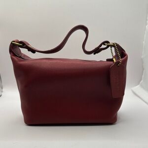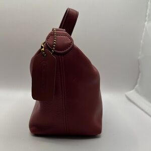 Vintage Coach Matte Red Leather Mini Bag, 6929. Brass hardware, COACH leather logo tag, inner slip pocket, inside is blue/white stripes lining.