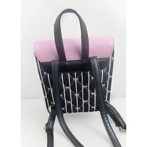 The Luv Betsey by Betsey Johnson Stacy Quilted Mini Backpack Bag is a stylish and feminine accessory for women. Featuring a bowtie pattern and a playful Stacie character design, this black and pink backpack is made from 100% polyurethane with a 100% polyester lining. The gold hardware adds a touch of sophistication, while the adjustable black strap ensures comfortable wear. This chic mini backpack includes inner pockets and a magnetic closure, making it both fashionable and functional for everyday use.