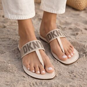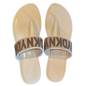 New without box DKNY logo thong sandals in a versatile nude patent finish, perfect for everyday summer wear.
