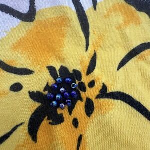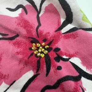 Pre-owned T-shirt with light overall wear and wash softness from previous use. Fabric, print, and stitching are clean and intact with beaded floral centers securely attached. Shirt shows wrinkling from storage; interior brand and care tags present, no additional accessories included.