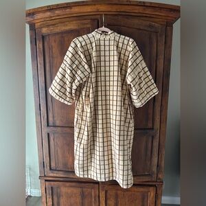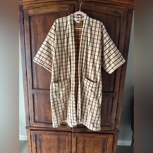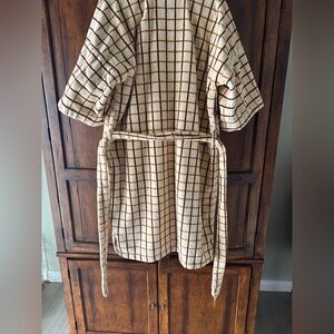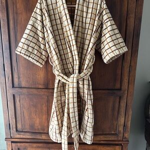 Cozy robe with a checkered pattern. Features a tie belt. Perfect for lounging.