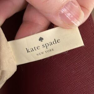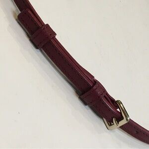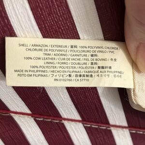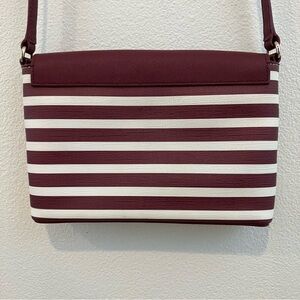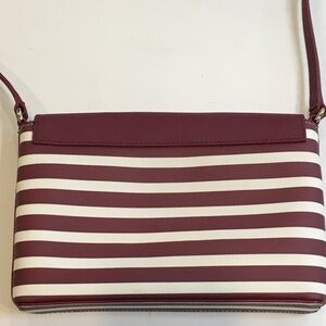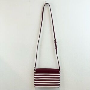 Burgundy & cream stripes Fairmount envelope style crossbody bag. Has an adjustable leather strap. Buckle has five holes & strap has a 23” drop. Envelope flap has a magnetic snap closure. Gold tone logo & hardware. Inside bag is lined with 100% Polyester fabric in cream with quotes all over. Has an open pocket inside. Bag measurements are approximately 8” x 6” x 1.5”. In excellent preowned condition with NO damage.