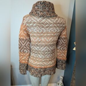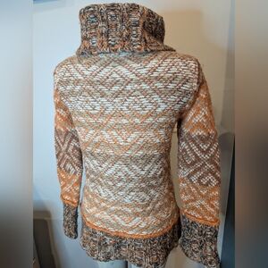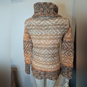 Cozy cowl neck sweater with intricate patterns. Features warm hues for a stylish look. Worn twice. Light friction wear and whiskering as per yarn blend