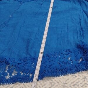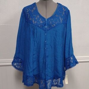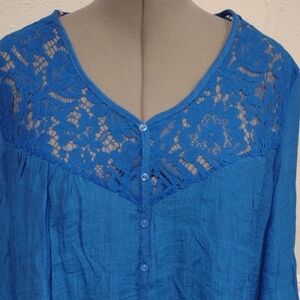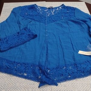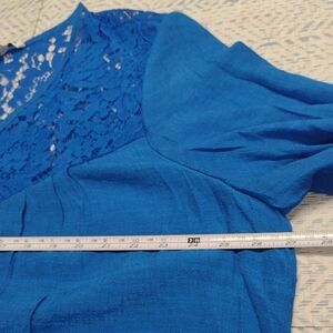 Chic royal blue blouse with lace accents. Button-up front. Flared sleeves with lace trim.