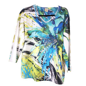 Jess & Jane Womens Large Top Lagenlook Floral Bohemian White Abstract Colorful Rhinestones